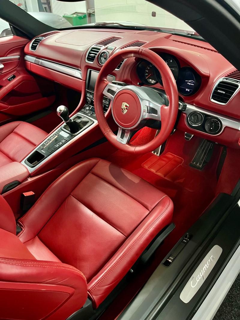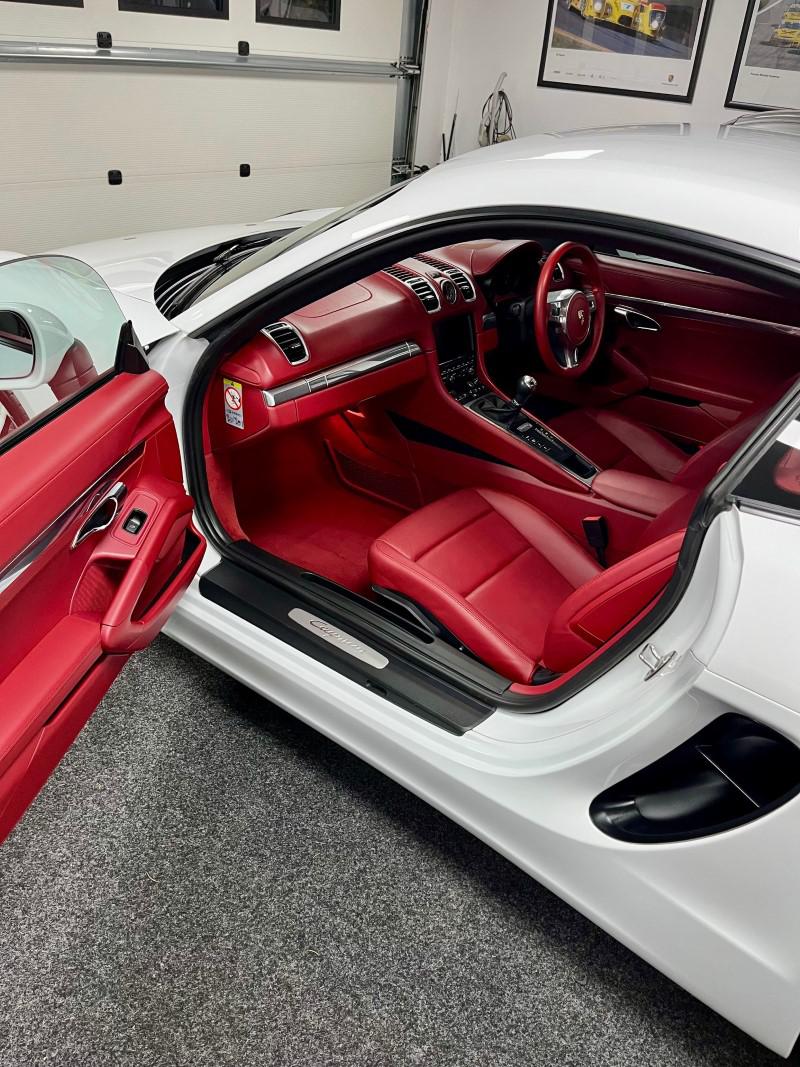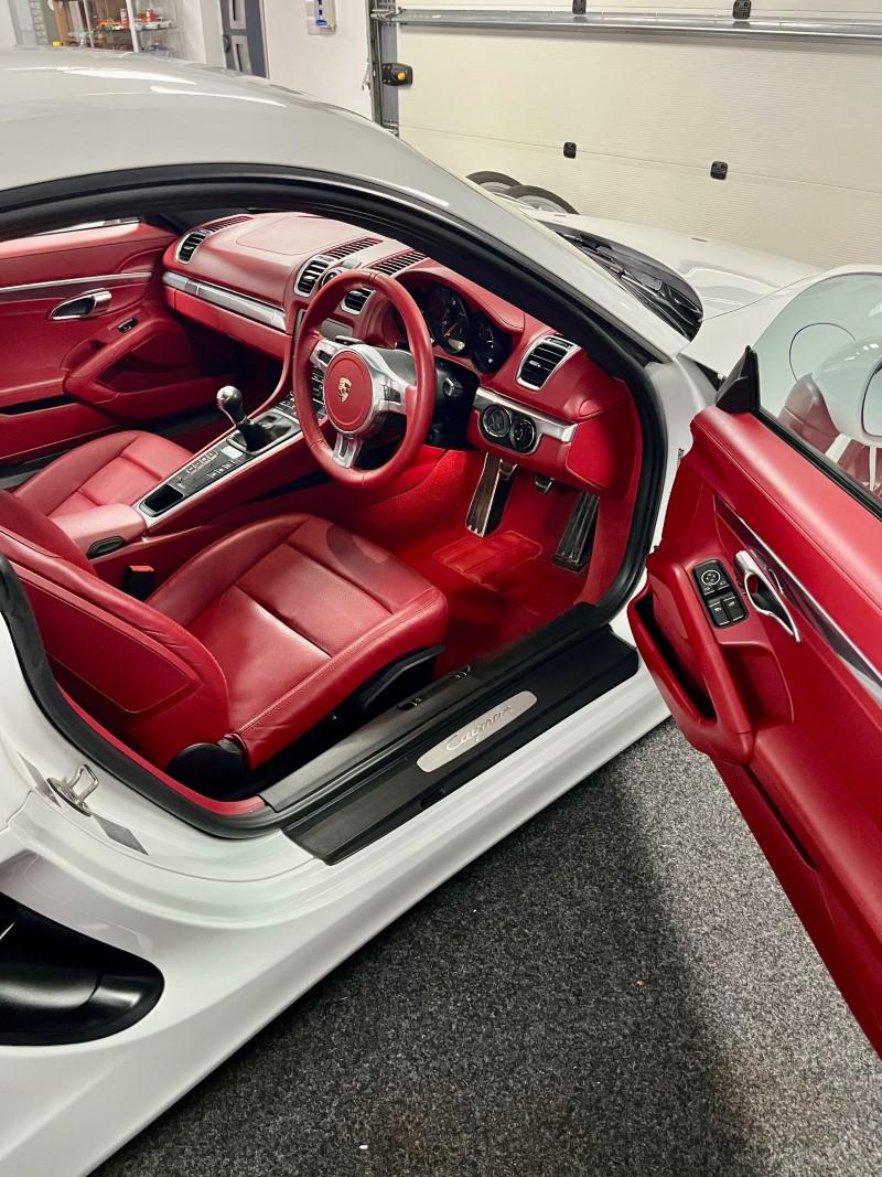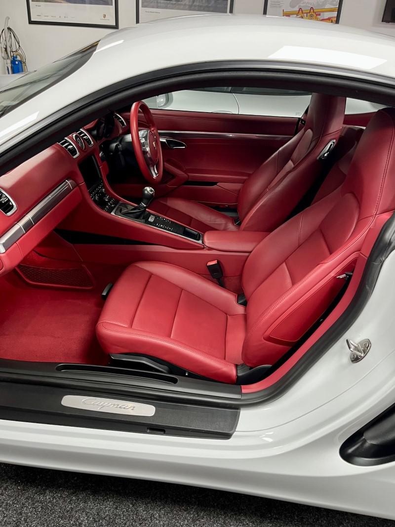 Porsche Cayman 2.7 manual 6 speed finished in Carrara White with full red leather including dash and door cards, mega spec includes front and rear park assist, sport chrono, sport/sport plus exhaust, 19" alloys, red calipers, sat nav, stunning car in looks and condition,